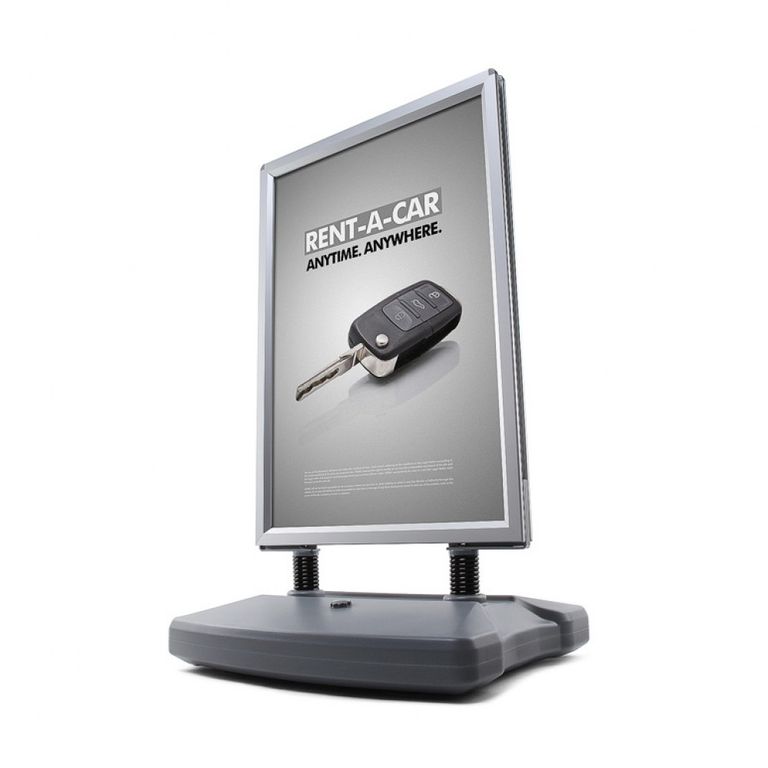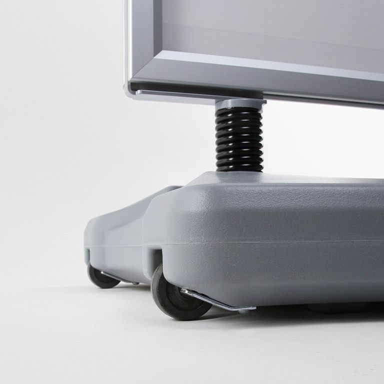 Speziell für Ihre Werbung in windigen Bereichen ist der Kundenstopper WINDTALKER® von Druckerei Hutzler in Grafenwöhr die optimale Lösung. Sein mit Wasser oder Sand befüllbarer Standfuß bietet in Verbindung mit den Spezialfedern aus Stahl eine hohe Standfestigkeit. Für den einfachen Transport sind im Standfuß Rollen integriert. So können Sie den Kundenstopper trotz des Standgewichtes einfach bewegen. Der Aluminium-Schnellwechselrahmen kann doppelseitig mit Plakaten bestückt werden und garantiert Ihnen auch bei hohen Windstärken eine auffällige Werbemöglichkeit.