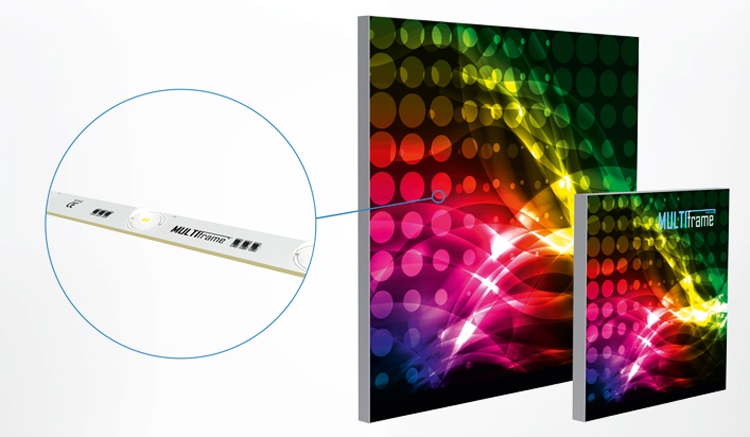Der MULTIframe SUPER SLIM von Druckerei Hutzler in Grafenwöhr ist ein vollflächig hinterleuchteter LED Rahmen mit einer Bautiefe von nur 35 mm. Das einseitig verwendbare Aluminiumrahmenprofil ist superflach und eignet sich hervorragend für Wandmontagen. Durch die spezielle Linsenform der LED Module kann man trotz der schmalen Bautiefe keinerlei Lichtpunktbildung auf der Stoffoberfläche entdecken – das Motiv wird einheitlich und schattenfrei dargestellt. Die Stoffgrafiken werden mit Gummilippen versehen. Dies ermöglicht einen einfachen und raschen Grafikwechsel. Nicht nur die Leuchtkraft von ca. 7000 lm, sondern auch die homogene Ausleuchtung, machen den MULTIframe SUPER SLIM zu einem Leuchtrahmen, der alle ähnlichen Produkte in den Schatten stellt. Alle Systemteile sind auch als Einzelteile erhältlich.