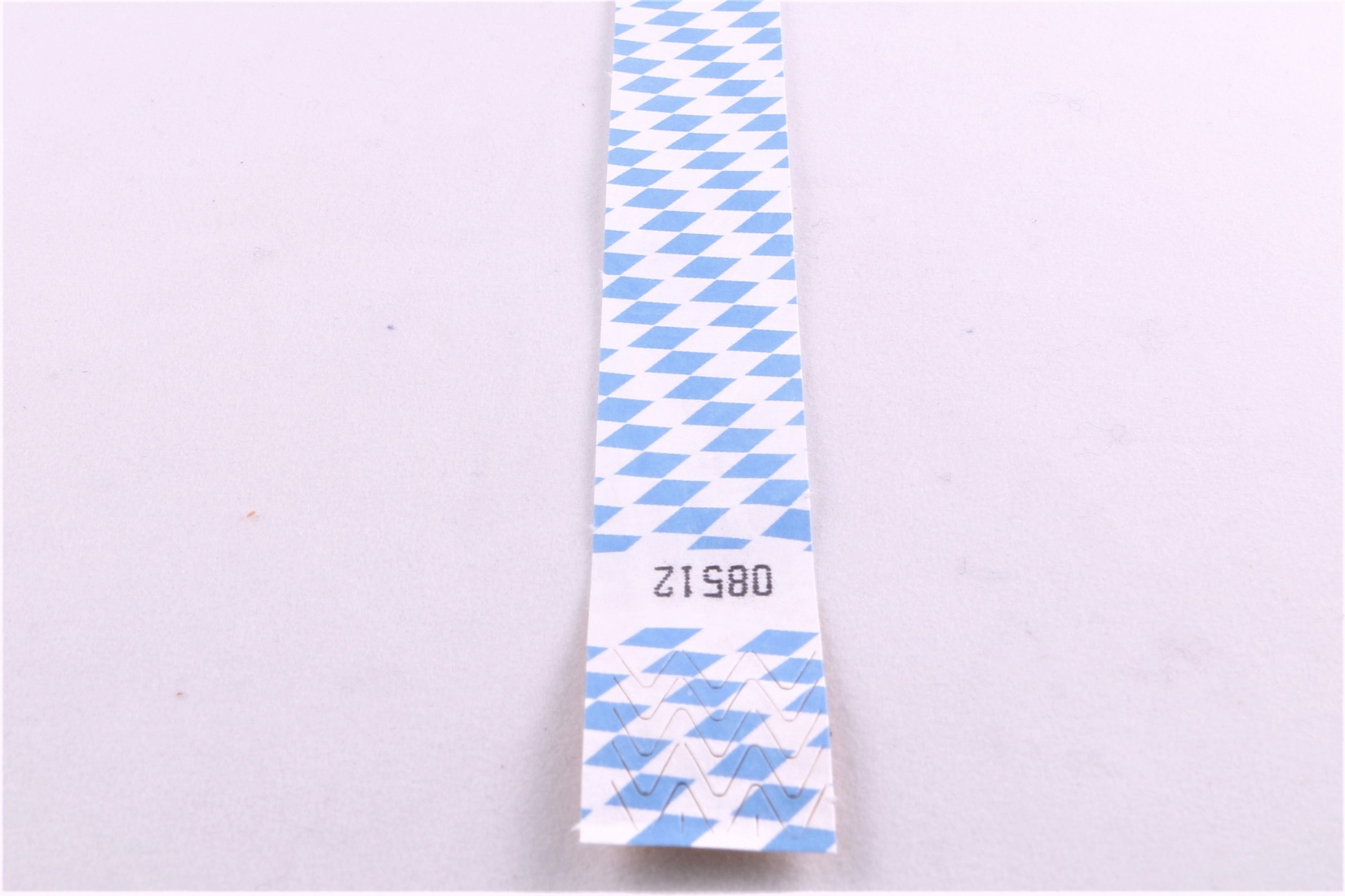 Die praktischen Einlassbänder aus papierähnlichem und reißfestem Tyvek mit vorgefertigten Motiven von Druckerei Hutzler in Grafenwöhr werden mit einem Klebestreifen verschlossen. Beim Öffnen des Klebestreifens wird die Perforation am Band zerstört. Somit sind unsere Tyvek-Bänder genau so sicher wie Einlassbänder mit Plastik-Verschluss und nicht übertragbar.